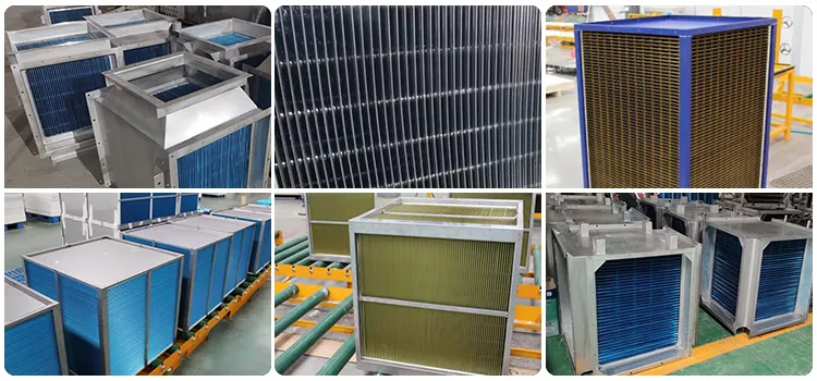 The most popular design now is square, with very even gaps between stacked aluminum plates and two intersecting channel designs. It not only has a compact appearance, but also has a very high heat transfer efficiency.